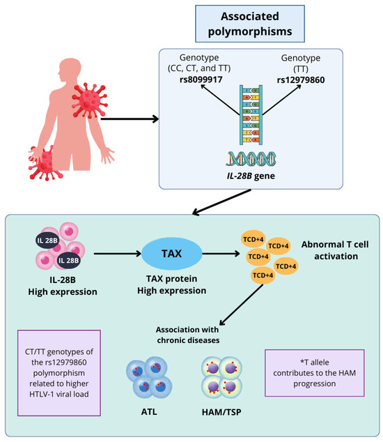 The rs8099917 and rs12979860 polymorphisms of the IL-28B gene play an important role in the pathogenesis of HAM/TSP; specifically, the TT genotype of the rs8099917 polymorphism is directly associated with an increased expression of the interleukin IL-28B, which causes an abnormal proliferation of CD4+ T lymphocytes, a mechanism that may promote chronic inflammation and increase the risk of development of mentioned diseases, which would result in the development of diseases such as ATL and myelopathy associated to HTLV-1. Regarding the rs12979860 polymorphism, the CC genotype confers a higher HTLV-1 viral load, suggesting that the *T allele is possibly closely related to the pathogenesis of the HTLV-1 infection, while contributing to both the development of AMH/TSP and its progression within the host infected by the virus.