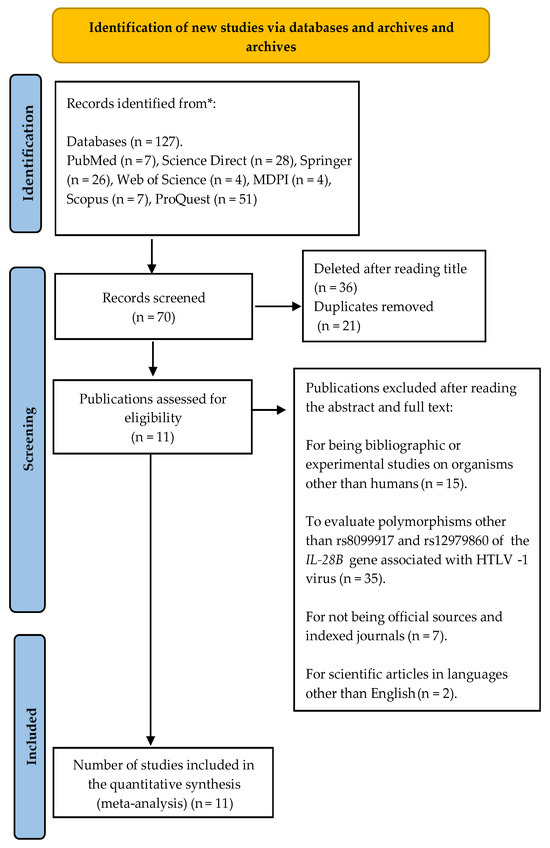 A total of 127 results were identified and distributed, 7 were identified in PubMed, 28 in Science Direct, 26 in Springer, 4 in Web of Science, 4 in MDPI, 7 in Scopus, and 51 in ProQuest. According to the exclusion and inclusion criteria, and after the initial review based on the titles and eliminating duplicates, 70 articles were considered relevant. Subsequently, the abstracts and full texts were read, which led to the exclusion of 59 studies according to the criteria described in Figure 2. Finally, 11 articles that met the predefined inclusion criteria [19,27,28,29,30,31,32,33,34] were selected; these studies focused on the evaluation of the genotypic frequency of polymorphisms in relation to experimental cases and controls, in the context of the analysis of susceptibility to diseases associated with the HTLV-1 virus.
