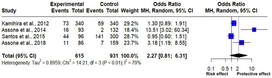 Similarly, four studies report an OR higher than 1; one of them [33] shows an OR of 1.06 [0.57; 1.96], indicating that the CT genotype in the Spanish population could be linked to a higher susceptibility to cytomegalovirus. This result contrasts with the study by [43] that describes a higher prevalence of the CT genotype of the rs12979860 polymorphism in patients with HAM/TSP associated with HTLV-1. Consequently, it is inferred that the presence of the T allele could play a role in the infection’s development and in the disease’s development, and in the disease’s clinical outcomes, favoring the development of HAM.