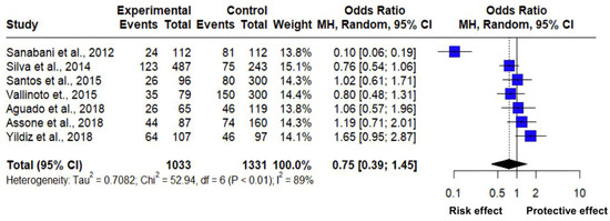 The association between the CC and CT genotype frequency of the rs12979860 polymorphism of the IL-28B gene was analyzed through a meta-analysis of seven studies (Table 4). The estimated mean odds ratio based on the random effects model for this association was 0.7547 (95% CI: 0.3922; 1.4524). In addition, the Z value was −0.84 with a p-value = 0.3994, indicating that it does not differ significantly from zero and that there is no significant difference between the evaluated polymorphism and the susceptibility to suffering from pathologies related to HTLV-1 (Figure 4).