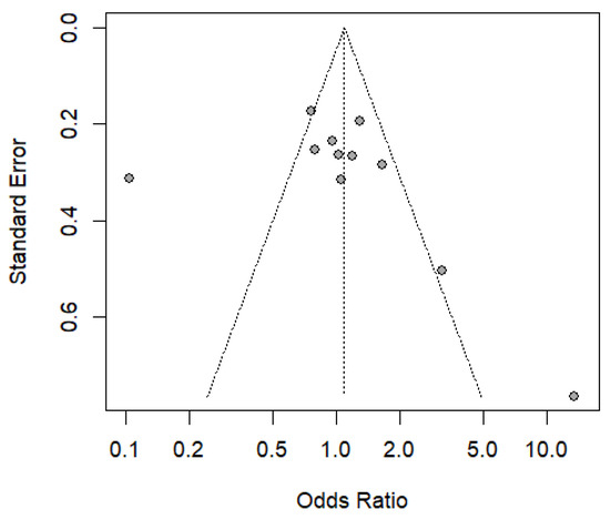 Figure 5 shows a funnel plot of the studies included in the meta-analysis, showing the existence of publication bias, due to its asymmetric distribution and significant differences. Concerning this, the regression test indicated the asymmetry of the funnel plot (p = 0.0202), but not the rank correlation test (p = 0.060), using the standard error of the observed results. The Trim and Fill method was applied to address this bias, which identified missing studies and adjusted the overall effect size by incorporating four additional studies. Following this correction, the recalculated random effects model yielded an odds ratio (OR) of 0.7225 [0.3936; 1.3263], with a p-value of 0.2943, indicating that the observed protective effect remains non-significant. Despite this adjustment, high heterogeneity (I2 = 89%) persists, suggesting considerable methodological and population differences across studies. Consequently, the results of the meta-analysis require further analysis and present a higher probability of overestimating the protective effect and the risk effect in relation to the genotype frequency of the HTLV-1-associated rs8099917 and rs12979869 polymorphisms.