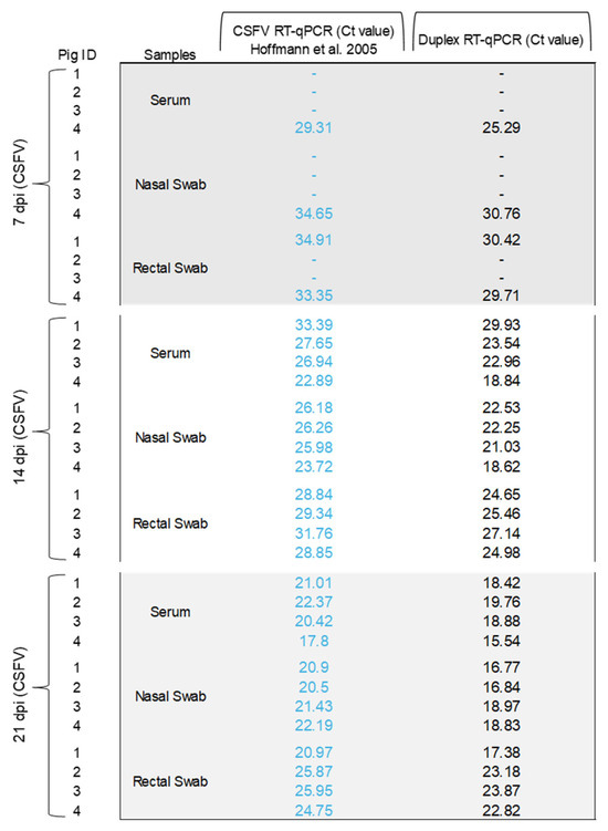 Detection of CSFV in clinical samples from experimental infected pigs using the duplex RT-qPCR assay. The Ct values obtained using CSFV RT-qPCR [22] are shown in blue. The Ct values obtained using CSFV-ASFV duplex RT-qPCR are shown in black.