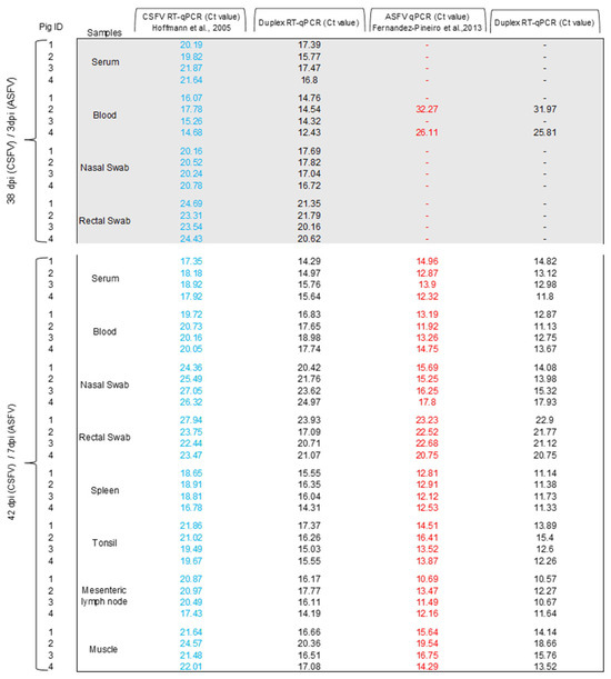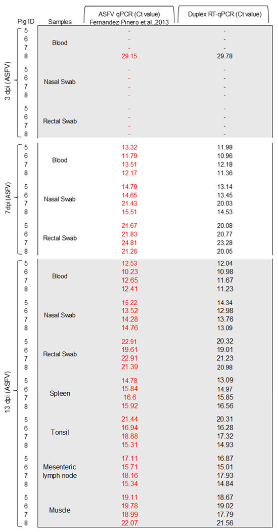 Detection of ASFV in clinical samples from experimentally infected pigs using the duplex RT-qPCR assay. The Ct values obtained using ASFV qPCR [21] are shown in red. The Ct values obtained using CSFV-ASFV duplex RT-qPCR are shown in black.