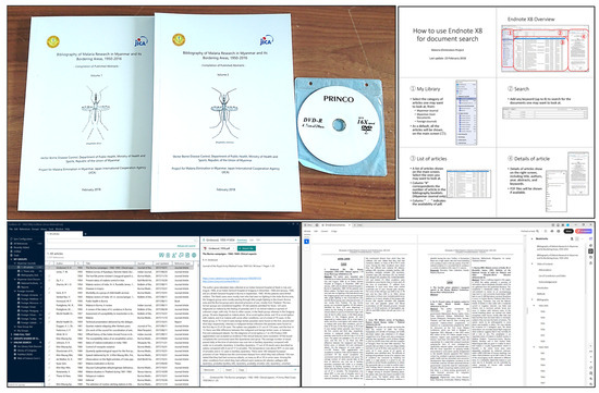 The collection of materials related to malaria in Myanmar included academic papers, theses and dissertation abstracts, and policy documents published from the 1950s to the end of 2016. Academic papers covered manuscripts on malaria control and prevention in Myanmar and neighboring countries. Several articles published in local journals were cataloged in the Department of Medical Research (DMR) Central Biomedical Library Database. Relevant online articles in the Myanmar Health Science Research Journal and Myanmar Medical Journal were downloaded as PDF files. However, most local articles were available in hard copy, so they were collected individually and stored in the facilities where they were located. All the collected materials were converted into PDF format. On the other hand, articles published in international journals were identified through academic databases, including the Cochrane Library, Google Scholar, J-Stage, and PubMed. In addition, three previously published abstracts found during the literature collection were also used as references [15,16,17]. The articles were downloaded from the WHO-HINARI (Health InterNetwork Access to Research Initiative) program via the university library network.
