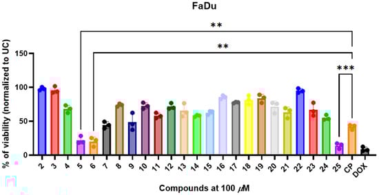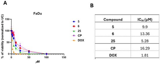 All selected compounds demonstrated low-micromolar, concentration-depended anticancer activity in FaDu cells (9.90–13.36 µM) (Figure 4A,B). Compounds 5, 6, and 25 exhibited higher anticancer activity in FaDu cells than CP (16.29 µM) (Figure 4).