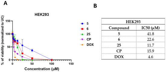 The selected 3,3′-((3-hydroxyphenyl)azanediyl)dipropionic acid derivatives (5, 6, and 25) exhibit favorable cytotoxic effects in non-cancerous HEK293T cells. (A) shows dose–response kinetics of compounds 5, 6, 25, and control pharmaceuticals in HEK293 cells, while (B) demonstrates the calculated IC50 values. Cells were treated with the compounds, cisplatin (CP), or doxorubicin (DOX) for 24 h, and viability was assessed by using the MTT assay. Data are presented as means ± SD from three independent experiments.