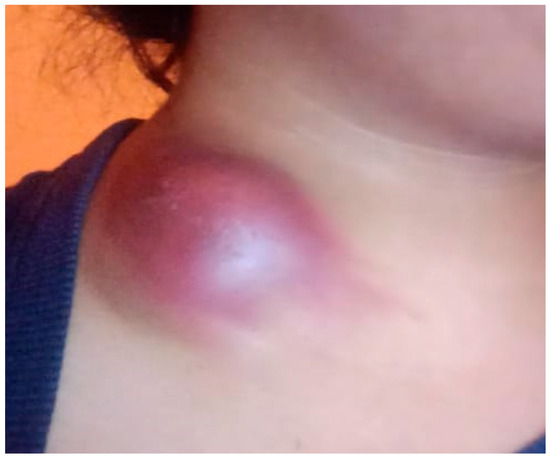 Acute subcutaneous inflammatory mass in the neck region. The image shows the clinical presentation observed in the patient, which includes a pathological mass on the anterolateral surface of the neck with marked localized hyperemia, edema, and a dome-shaped tissue protrusion. The skin in this area appears taut and glossy, indicating increased intratissue pressure.