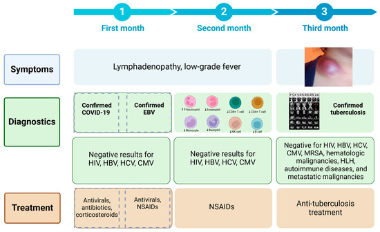 Given the overlapping symptomatology of COVID-19, EBV, and TB—such as fever, lymphadenopathy, and fatigue—accurate and timely differential diagnosis is essential [59,60]. Comprehensive diagnostics, including serological, molecular, and histopathological evaluation, are necessary to identify the causative agent [61,62,63]. Co-infections may obscure the clinical picture and delay treatment initiation [64,65,66], particularly in patients with comorbidities that further compromise immunity [67,68].