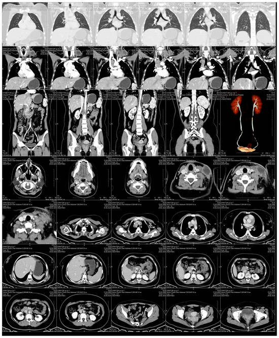 Neck ultrasound demonstrated bilateral hypoechoic lymphadenopathy with increased vascularity. CT imaging revealed a large, encapsulated fluid collection in the left supraclavicular area, alongside enlarged paratracheal and subcarinal lymph nodes with necrotic changes (Figure 3). No pulmonary lesions or abdominal pathology were noted. Imaging was performed using a Philips iU22 ultrasound system with a high-frequency linear probe (12–15 MHz) for detailed soft tissue imaging. CT scanning was carried out on a Siemens Somatom Definition AS 64-slice CT scanner (Siemens Healthineers, Forchheim, Germany), with contrast enhancement for better visualization of the fluid collection and lymph node enlargement.