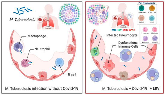 The impact of SARS-CoV-2 and Epstein–Barr Virus (EBV) co-infection on tuberculosis progression. The figure compares tuberculosis infection in the absence (left) and presence (right) of SARS-CoV-2 and EBV co-infection. The left panel illustrates an effective immune response against Mycobacterium tuberculosis (M. tuberculosis), where macrophages, neutrophils, and B cells help control the infection. In contrast, the right panel shows how co-infection with SARS-CoV-2 and EBV leads to immune dysfunction, including infected pneumocytes, dysregulated immune cells, and pan-lymphopenia (reduced CD4+ T cells, CD8+ T cells, NK cells, and B cells). This weakened immune defense increases the risk of tuberculosis reactivation and progression, underscoring the need for close monitoring and early intervention in affected patients.