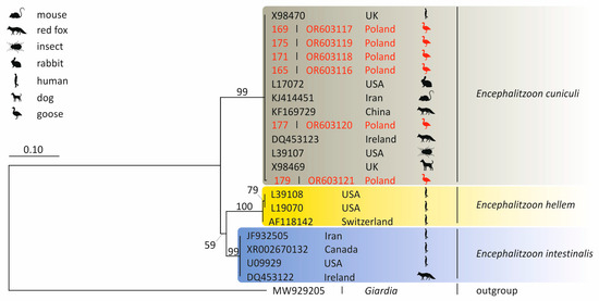 - Perec-Matysiak, A.; Buńkowska-Gawlik, K.; Kváč, M.; Sak, B.; Hildebrand, J.; Leśniańska, K. Diversity of Enterocytozoon bieneusi genotypes among small rodents in southwestern Poland. Vet. Parasitol. 2015, 214, 242–246. [Google Scholar] [CrossRef]