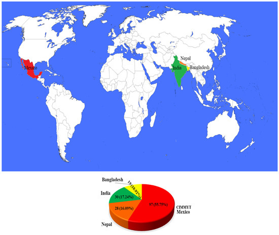 In the present investigation, we utilised a panel of 174 CSASWG lines. Among them, 97 genotypes (CIM-1 to CIM-97) were obtained from CIMMYT-Mexico, 30 genotypes (IND-1 to IND-21, IND-28, IND-30 to IND-36, and IND-38) from India, 28 genotypes (NPL-1 to NPL-28) from Nepal, and 19 genotypes (BGD-1 to BGD-19) from Bangladesh (Figure 1). These genotypes are indicative of the current top-tier varieties and breeding lines within their respective organisations and countries (Supplementary Table S1).