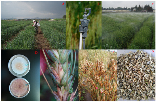FHB disease screening at CIMMYT-Mexico. (A) Spray inoculation with F. graminearum inoculum; (B) Nozzle used for the automatic misting system; (C) Mist irrigation in the FHB screening field; (D) Laboratory culture of an F. graminearum isolate; (E) FHB on a wheat spike, showing symptoms of chlorosis, necrosis, and salmon-coloured mycelial mass; (F) A highly susceptible wheat line showing necrosis caused by FHB; (G) F. graminearum infected wheat grains.