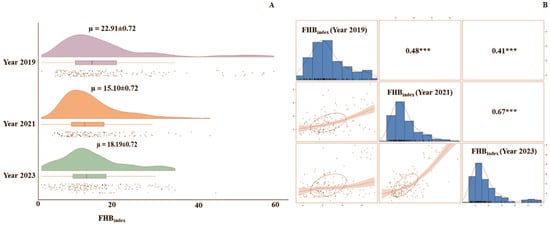 FHB infection in the CSASWG panel. (A) Raincloud distribution plots for FHBindex in the three years, with mean FHBindex and S.E. values indicated at the top of each plot. (B) Histogram distribution of FHBindex in individual years and correlation plots and values for the three years. “***” indicates significance at the p < 0.0001 level.