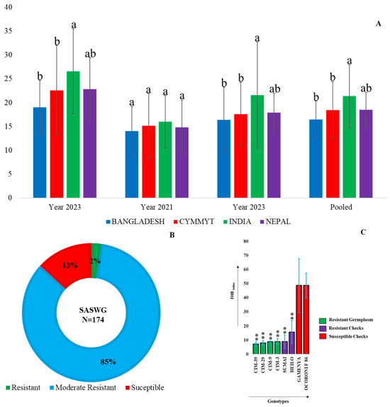 (A) Mean FHB indices of different country groups in individual years. The letters above the bars indicate groups that are significantly different at the 5% significance level. (B) Distribution of 174 genotypes according to FHB resistance. (C) Differences between checks and identified resistant lines. “**” indicates significance at the 1% confidence level.