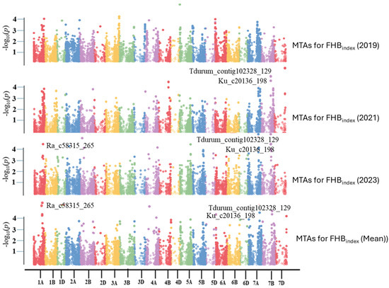 Four different algorithms, namely GLM, MLM, MLMM, and FarmCPU, were initially compared to select the best algorithm for association analysis. MLMM better fits the FHB disease data and was used to identify significant MTAs with a significance threshold of p < 1 × 10−4. Nineteen significant markers were identified on eight chromosomes, of which three were repeatable across different experiments and were located on chromosomes 1A and 7B (Table 2 and Figure 6). Phenotypic variations explained (PVE) by the three significant SNPs, i.e., Ra_c58315_265 (on chromosome 1A), Tdurum_contig102328_129 (7B), and Ku_c20136_198 (7B), ranged from 3.34 to 6.05% (Table 2). PVEs of other significant SNPs were also low, ranging from 2.05 to 6.23% (Table 2).