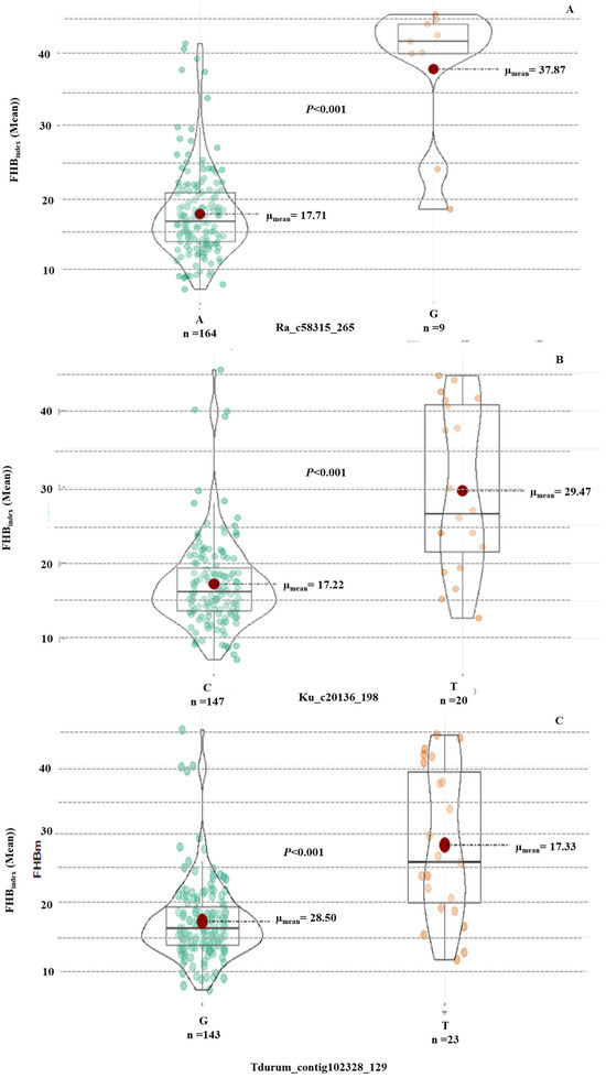 Effect of different alleles using the Wilcoxon test for (A) MTA Ra_c58315_265 with FHBindex (mean), (B) MTA Ku_c20136_198 with FHBindex (mean), and (C) MTA Tdurum_contig102328_129 with FHBindex (mean).
