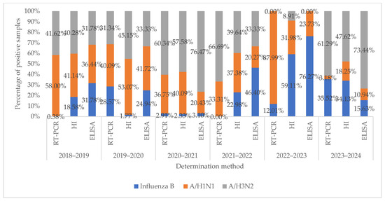 When comparing the data obtained by rtRT-PCR on the prevalence of influenza viruses in nasopharyngeal swabs from 2018 to 2024 and the presence of antibodies in HI and ELISA during this period, a correlation was found between these data (Figure 4). Detection of antibodies to the influenza virus in serological studies is mainly associated with information on the spread of the influenza virus during a certain period of the epidemic. However, in contrast to the rtRT-PCR data showing a low frequency of detection of the influenza B virus in 2018–2019 and 2021–2022, the presence of antibodies to this influenza virus was detected more often in serological studies. Such a discrepancy may indicate the persistence of antibodies to the influenza virus after the previous epidemic or induced immunity after vaccination.