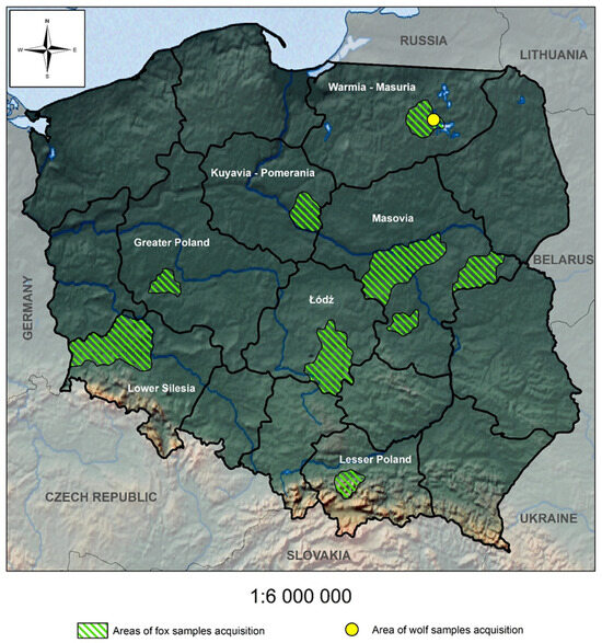 Wild animals can act as hosts for parasites of medical and veterinary significance and thereby constitute a direct or indirect source of infection for humans and domestic/farmed animals [1,2,3]. In Europe, the red fox (Vulpes vulpes) is recognised as an important host for a range of parasite species, including ectoparasites, helminths and bacteria [4,5,6,7]. Foxes’ adaptability to local environmental characteristics and their vagility facilitate the dispersal of parasitic organisms that they carry to new non-endemic areas for the organisms concerned [8,9]. In Poland, foxes are regarded legally as game animals, with a population size estimated at 200,000 individuals in 2023 [10].