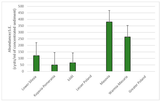 Overall mean abundance of G. intestinalis infection was 126.08 ± 46.25 cysts/1 mL of concentrated sediment, and this was similar in males (128.6 ± 53.10) and females (123.55 ± 75.75; NS). Abundance of G. intestinalis differed between voivodeships: the highest abundance was observed in animals from the Masovia and Warmia-Masuria Voivodeships, and the lowest for those from the Kuyavia-Pomerania Voivodeship (main effect of voivodeship on Giardia abundance: F6,116 = 2.09, p = 0.006; Figure 3).