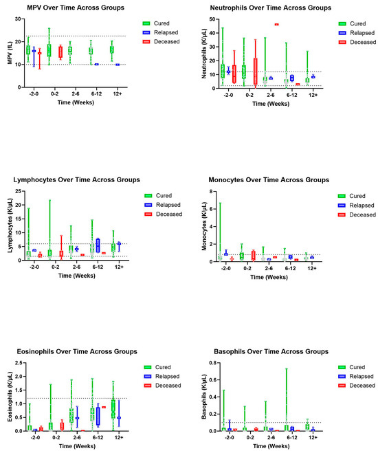 Additional leukocyte and PLT parameters (top–bottom and left–right): MPV, neutrophils, lymphocytes, monocytes, eosinophils, and basophils over time, in weeks, for cured, relapsed, and deceased patients. Dashed lines indicate CSU RIs. The grey dots represent individual data points.