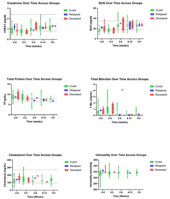 Laboratory results attached to weekly surveys were manually input into an excel spreadsheet. Colorado State University (CSU) reference intervals (RIs) for routine hematologic and biochemical parameters are the following: hemoglobin (HGB) 9.8–15.5 g/dL, HCT 32–47%, red blood cell (RBC) 6.5–10 106/uL, mean corpuscular value (MCV) 40–52 fL, red cell distribution width (RDW) 13.5–19%, mean corpuscular hemoglobin concentration (MCHC) 32–36 mg/dL, WBC 4.0–14.0 103/uL, reticulocyte 0–50 103/uL, platelet (PLT) 200–500 103/uL, mean platelet volume (MPV) 10–22.5 fL, neutrophil 2–12 K/uL, lymphocyte 1.5–6 K/uL, monocyte 0–0.8 K/uL, eosinophil 0–1.2 K/uL, basophil 0–0.1 K/uL, glucose 68–140 mg/dL, creatinine (CREAT) 0.8–2.4 mg/dL, BUN 18–35 mg/dL, phosphorus 3–6 mg/dL, calcium (Ca) 9.2–11.1 mg/dL, total protein (TP) 6.3–8.0 g/dL, albumin 3.1–4.4 g/dL, globulin 2.7–4.2 g/dL, A/G ratio 0.8–1.6, cholesterol 95–270 mg/dL, T-BIL 0.0–0.1 mg/dL, alkaline phosphatase (ALP) 10–80 U/L, alanine aminotransferase (ALT) 30–140 U/L, gamma-glutamyl transferase (GGT) 0–0.5 U/L, sodium (Na) 149–157 mmol/L, potassium (K) 3.7–5.4 mmol/L, and chloride 115–125 mmol/L. These RIs were used in the graphical representation of these data. Statistical analysis was performed in GraphPad Prism version 10.1.2 for Windows (GraphPad Software, Boston, MA, USA, www.graphpad.com, accessed on 26 August 2024). Due to the small sample size of cats in the relapsed and deceased groups, these groups were combined into one for comparison with cured cats. Two-sample t-tests were used for comparisons between these two groups.