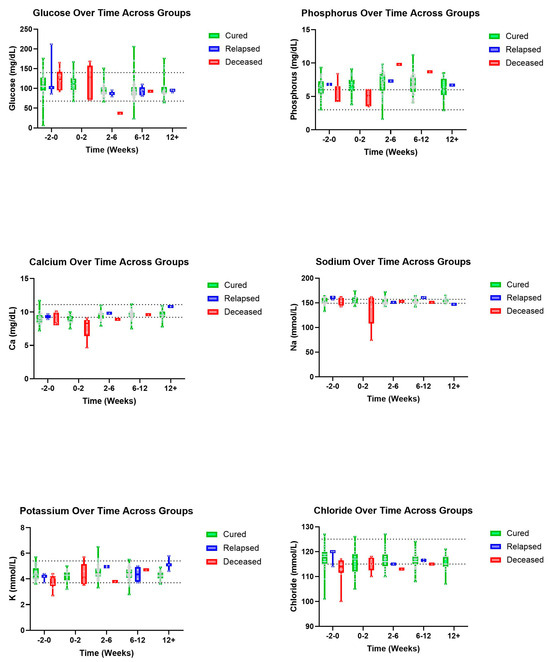 Biochemical parameters (top–bottom and left–right): Glucose, P, Ca, Na, K, and chloride over time, in weeks, for cured, relapsed, and deceased patients. Dashed lines indicate CSU RIs. The grey dots represent individual data points.