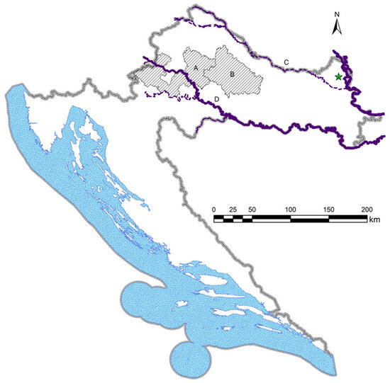 The asterisk in Figure 1 shows the approximate location of the first confirmation of F. magna in cervids in Croatia, at the Šeprešhat locality in the Baranja region [14]. Two main rivers, the Danube and Sava River, are presented as solid blue lines, indicating potential main routes of spread of F. magna northwards from its entry point into Croatia. Livers were collected during the regular execution of approved Game Management Plans (GMPs) and analysed within the Croatian Science Foundation grant (no. IP-8963). Since sample size and the selection of animals depended on hunters, all available livers were collected (non-probability convenience sampling).