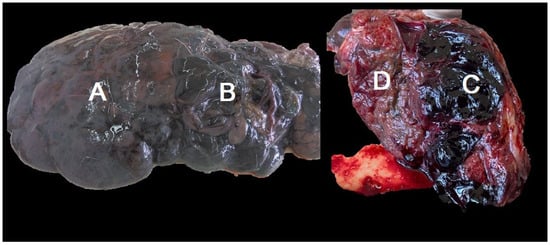 Figure 2 shows a typical roe deer liver infected with F. magna, without the formation of the pseudocyst, while Figure 3 shows an infected roe deer liver with the formation of the pseudocyst and retained function. In the liver presented in Figure 3, irregularities of the surface are less pronounced. Traces of black pigment called iron-porphyrin are present and are considered a pathognomonic sign of F. magna infection. The liver edges are still sharp, and liver size is near normal. Part of the diaphragm is attached to the liver. The cut surface of the liver shows a well-developed pseudocyst. The pale walls of the pseudocyst are characteristic for a longer duration of infection.
