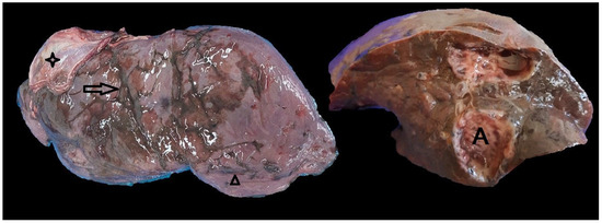 Macroscopic appearance of an infected roe deer liver. On the left image, note iron-porphyrin (arrowhead), surface irregularities (arrow) and remnants of the diaphragm attached to the surface of the liver (four-point star). In the cross-section of the same liver, note the well-developed pseudocyst (A).