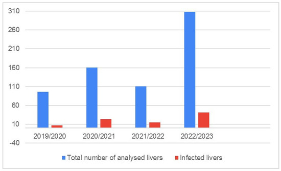 The number of infected livers, presented as a proportion with respect to sample size, is presented in Figure 4.