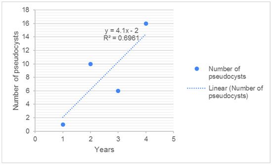 The number of pseudocysts in roe deer livers during the study period from BB, linear regression.
