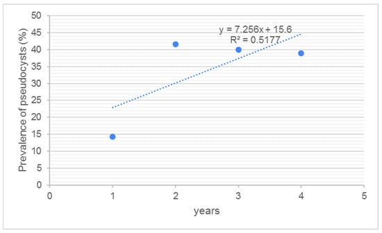 The odds ratio analysis indicated an apparent increase in the likelihood of pseudocyst presence over time; however, none of the results reached statistical significance. Specifically, the odds of pseudocyst detection were 2.9 times higher in 2020/21 compared to 2019/2020 (OR = 2.9167, CI 95% 0.3163 to 26.8924, p = 0.345). In 2021/2020, the odds were 2.8 times higher (OR = 2.800, CI 95% 0.2809 to 27.9081, p = 0.380), and in 2022/2023, they were 2.7 times higher (OR = 2.7317, CI 95% 0.3108 to 24.0095, p = 0.365) compared to 2019/2020. Therefore, despite the fact that the odds ratio may be biologically suggestive, the lack of statistical significance and wide CI suggest that potential conclusions about host adaptability should be interpreted with caution.