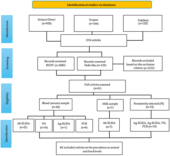 The objective of this systematic review and meta-analysis was to identify and analyze research articles on bovine pestiviruses in cattle across Latin American countries. A comprehensive literature search was conducted, selecting studies published in indexed journals, including PubMed, ScienceDirect, and Scopus. Eligible publications were those available in English, Spanish, or Portuguese and published between 2000 and 2024. The search strategy utilized specific keywords such as “Prevalence” OR “Frequency” followed by the disease name “BVDV” OR “Bovine Viral Diarrhea Virus” OR “HoBi-Like”, and the different countries of Latin America such as “Argentina”, “Bolivia”, “Brazil”, “Chile”, “Colombia”, “Costa Rica”, “Cuba”, “Dominican Republic”, “Ecuador”, “El Salvador”, “Guatemala”, “Haiti”, “Honduras”, “Mexico”, “Nicaragua”, “Panama”, “Paraguay”, “Peru”, “Uruguay”, and “Venezuela”. Considering the importance of PI animals, a search was carried out with “Persistent Infected” followed by the disease name “BVDV” OR “HoBi-Like”, and the different countries of Latin America. The criteria considered for the selection of studies are presented in Table 1.