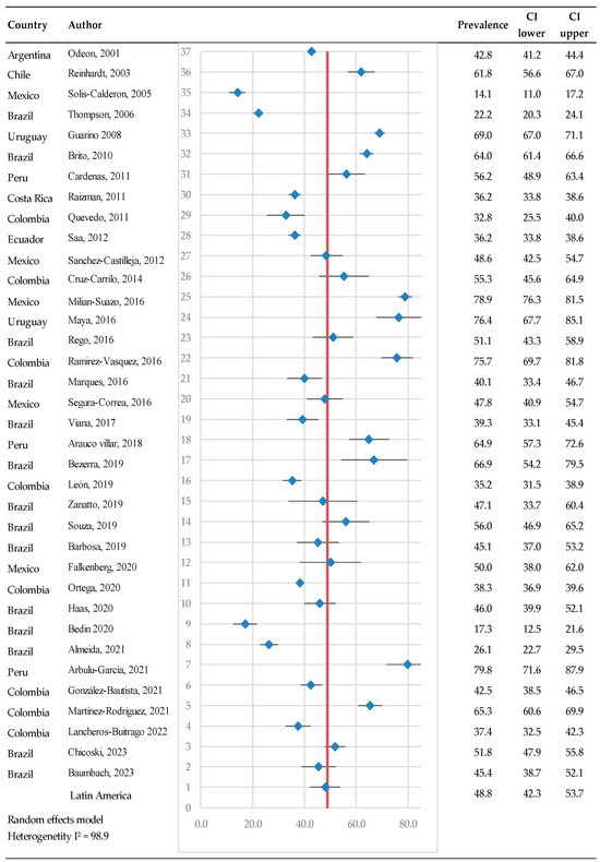 The prevalence of bovine pestivirus antibodies in serum samples using a random-effects model was found to be 48.8% (95% CI: 42.3–53.7) (Figure 2). The seroprevalence included 36 studies at the animal level, 50,285 observations, and 25,324 events. The heterogeneity test results indicated Q = 322.4 and I2 = 98.9, suggesting high heterogeneity between studies. Significant statistical differences were observed between countries, with the highest prevalence reported in Peru at 79.8% [56], followed by Uruguay at 76% [29], and the lowest prevalence reported in Mexico at 13.9% [27]. Argentina had a prevalence of 42.8%, Ecuador 36%, Colombia 32.7% to 75.73%, Chile 61%, Costa Rica 36.2%, Mexico 13.9% to 78%, Peru 56.1% to 79.8%, and Uruguay 69.0% to 76.4%. However, there are great differences between regions of the same country. When considering individual countries, Brazil presented a prevalence ranging from 16.7% to 67.0%.