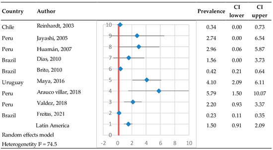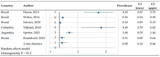 Various methodologies and diagnostic approaches were used to identify PI animals, including RT-PCR, Ab-ELISA, Ag-ELISA, and VN with various intervals between sampling to confirm the PI status. Studies have been conducted in Chile, Colombia, Brazil, and Peru (Figure 6). Most of the studies reported low frequencies of PI animals. The prevalence of PI animals was 1.5% in Latin America (95% IC 0.91–2.09%), involving a total of 5816 evaluated animals, with a total of 61 PI animals identified. The heterogeneity test results showed Q = 31.3 and I2 = 74.5, indicating high heterogeneity between studies.