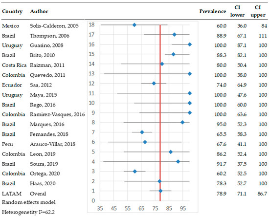 The prevalence of antibodies at the herd level was more uniform compared to the prevalence observed in individual animals across Latin America. Seventeen studies provided data on herd-level prevalence, encompassing a total of 2695 herds. Among these, 2124 herds had at least one positive case. Five studies reported that 100% of herds contained at least one animal positive for bovine pestivirus, while the remaining studies indicated prevalence rates ranging between 60% and 90%. Overall, the herd-level prevalence was estimated at 78.9% (95% CI: 71.1–86.7%) (Figure 4). The heterogeneity test results showed Q = 42.3 and I2 = 62.2, indicating moderate heterogeneity across the studies.
