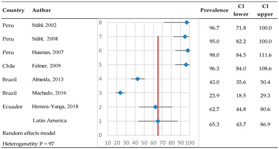 Subgroup evaluation was conducted in serological studies at the animal level to observe the differences between the prevalences by age, countries, and the type of herd (Table 5). The analysis by age revealed differences in prevalence between animals under one year old, at 39.4%, and adult animals, at 55.1%. The prevalence by country shows high prevalence rates in Uruguay and Peru, while prevalence was low in Mexico. However, it is important to note that some countries have a more significant number of studies and better territorial coverage. No significant differences were observed in prevalence based on temporality, herd type, or production model.