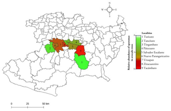 In the nine sampled locations, the highest number of sporomas was detected on the branches of trees infected with Trametes, revealing that the fungus has an efficient dispersal mechanism in the environment, mediated in part by air currents. Interestingly, comparing the average number of sporomas in the trees of the different locations, it was observed that precipitation is an important environmental factor that could favor the spread of fungus. Turicato, a locality with fewer sporomas per tree and low rainfall, was recorded, while the number of sporomas and rainfall were higher in the other locations, as in Ziracuaretiro. Interestingly, an examination of the map we constructed in this article shows that the nine localities where Trametes was found are interconnected, which strongly suggests the spread of the pathogen in the avocado belt of the state of Michoacán. However, it is necessary to investigate the environmental and horticultural management conditions that favor the proliferation of Trametes in more depth.