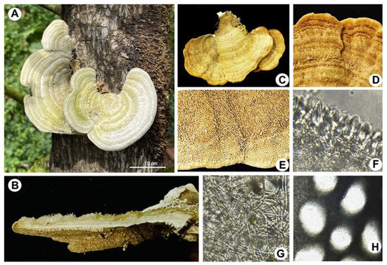 The genus Trametes (Polyporales: Polyporaceae) comprises wood-decay fungi, whose species are distributed in practically all terrestrial ecosystems colonized by trees that provide wood or food resources [1,2,3,4,5,6]. Trametes spp. are characterized by the presence of the sporoma firmly anchored to the trunk of the host tree, forming clusters. Although the occurrence of Trametes is more common in the autumn season, it can be seen throughout the year [7,8].