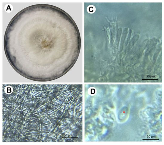 Mycelial and microscopic morphology of Trametes sp. (A) Fungal colony formed by the mycelial form of Trametes in PDA. (B) Hyaline mycelium from a 15-day-old fungal colony. (C) Basids (15–20 × 5–7 µm) and (D) Spore (8 × 5 µm); the red asterisk shows the localization of such structure. Sample collection in the avocado orchards took place during the rainy season of 2022.