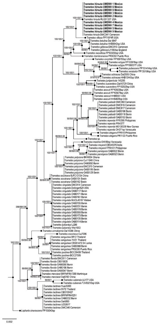 All PCR reactions were carried out in a PTC-200 Peltier thermal cycler (BIORAD, Mexico City Mexico). PCR products were verified by agarose gel electrophoresis. Gels were run for 1 h at 95 V cm−3 in 1.5% agarose and 1× TAE buffer (Tris Acetate-EDTA). The gel was stained with GelRed (Biotium, Fremont, CA, USA) and bands were visualized on an Infinity 3000 transilluminator (Vilber Lourmat, Eberhardzell, Germany). Amplified products were purified with the ExoSAP Purification kit (Affymetrix, Santa Clara, CA, USA), following the manufacturer’s instructions. They were quantified and prepared for the sequencing reaction using a BigDye Terminator v.3.1 (Applied Biosystem, Foster City, CA, USA). These products were sequenced in both directions using an Applied Biosystem model 3730XL (Applied BioSystems, Foster City, CA, USA). To generate consensus sequences, the sequences of both strands of each gene were analyzed, edited, and assembled using BioEdit version 7.0.5 [20]. These consensus sequences were compared with those deposited in GenBank at the National Center for Biotechnology Information (NCBI), using the BLASTN 2.2.19 tool [21]. The sequences were subjected to standard Nucleotide BLAST searches in GenBank to determine the primary identity of the fungal isolates. Lopharia cinerascens [4] was used as an outgroup.