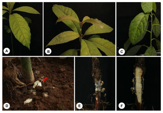 Pathogenicity tests of T. hirsuta on avocado seedlings. (A) Foliage of the control treatment. Signs of the disease caused by the fungus: (B) chlorosis and (C) wilting. (D) Establishment of the fungus and formation of a dense body of fungal biomass associated with the host stem, red arrow phytopathogen mycelium. (E) Invasion and evident necrosis of the bark and part of the cabium of the young tissue of avocado seedlings. (F) Longitudinal section of the stem infected with T. hirsuta showing the softening of the woody tissue caused by the white rot (white dotted) of T. hirsute.