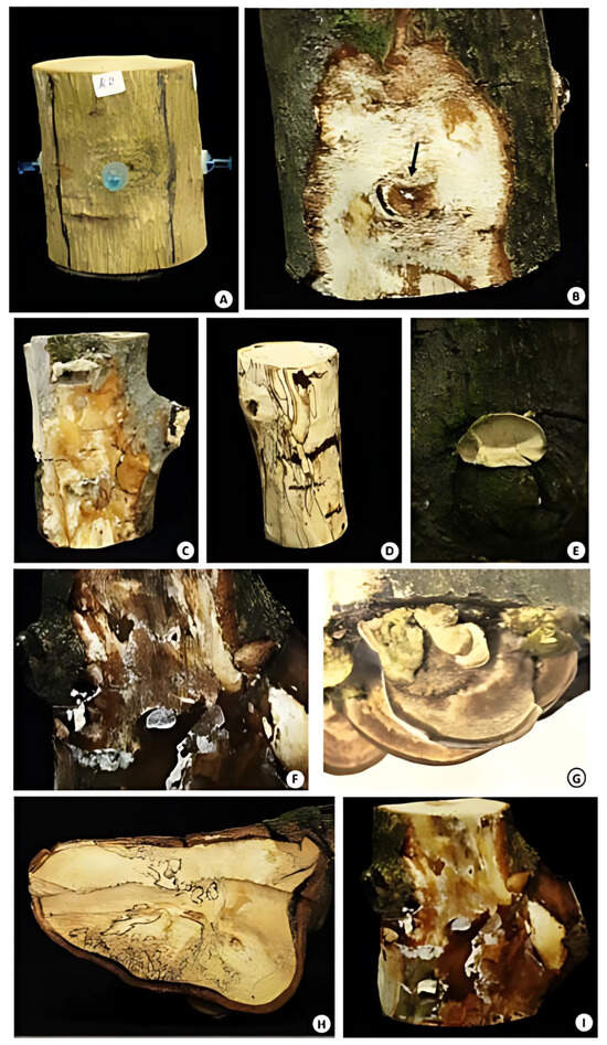 Pathogenicity tests for T. hirsuta in avocado woody tissue. (A) Control avocado trunk (control). (B) Cross section with lesion of the infection site where the phytopathogen was inoculated (black arow). (C,F,I) Spongy-looking white rot with invasion of mycelium in the sapwood of the wood. (D) External diagnosis of the wood infection: pale coloration of the tissue is a characteristic sign of the white rot. (E) Primordium of T. hirsuta. (G) Sporomas obtained from inoculation, an evident sign of the disease. (H) Localized necrosis and white rot in the sapwood, heartwood, and pith of the tissue. The experiment was conducted twice with simulated results.