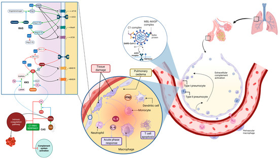 Summary of COVID-19 pathophysiology: postulates and data known before this study. SARS-CoV-2 triggers a local alveolar inflammatory response, with complement system activation, chemokine and cytokine releases, and white blood cell recruitment and degranulation. This growing inflammatory response causes tissue damage and starts a vicious positive feedback loop. A similar response occurs when the virus reaches the capillary bloodstream, damaging the endothelial cells and causing capillary leakage and pulmonary oedema. On the other hand, SARS-CoV-2 binding to the ACE2 receptor leads to its downregulation, which (i) decreases the Ang-(1–7) levels, and thus, reduces the ACE2/MasR pathway anti-inflammatory signalling, and (ii) also lowers the degradation of DABK (an active byproduct of BK), increasing the inflammatory signalling through the BKB2R. Additionally, several SARS-CoV-2 proteins interact with the C1 inhibitor, a main CAS regulator, reducing its inhibitory ability over the complement and kinin–kallikrein systems, and the coagulation system. Altogether, these snowballing inputs enhance the levels of circulating proinflammatory cytokines, causing the widely reported cytokine storm. Abbreviations: A, Aminopeptidase; ACE, Angiotensin-Converting Enzyme; Ang, Angiotensin; AT1R, Angiotensin II Type 1 Receptor; AT2R, Angiotensin II Type 2 Receptor; BK, Bradykinin; BKB1R, Bradykinin B1 Receptor; BKB2R, Bradykinin B2 Receptor; C1, Complement Factor 1; C1-INH/SERPING, C1 Inhibitor (encoded by the Serine Protease Inhibitor [SERPIN] family G member I); CAS, contact activation system; DABK, des-Arg9-Bradykinin; FXII, Coagulation Factor XII; FXIIa, Activated Coagulation Factor XII; HMWK, High-Molecular-Weight Kininogen; IFNβ, Beta Interferon; IL-6, Interleukin 6; IL-8, Interleukin 8; KI, Kininase I; KKS, Kinin–Kallikrein system; LMWK, Low-Molecular-Weight Kininogen; MASP, Mannan-Binding Lectin-Associated Serine Protease; MasR, Mas Receptor; MBL, Mannose-Binding Lectin; PK, Plasma Kallikrein; PPK, Pre-kallikrein; PRCP, Prolylcarboxypeptidase; RAS, Renin-Angiotensin System; SARS-CoV-2, Severe Acute Respiratory Syndrome Coronavirus 2; TK, Tissue Kallikrein; TMPRSS2, Transmembrane Serine Protease 2. Adapted from “Lung and Alveoli with Callout (Layout)” and “Alveolar-Capillary Barrier”, by BioRender.com (2023). Retrieved from https://app.biorender.com/biorender-templates (accessed on 30 August 2023).