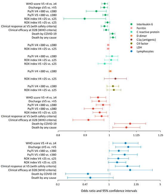 Summary of the association analyses (binary logistic regression) of milestones over markers (38 selected pairs) to learn the direction of the associations. The association was in general inverse for favourable outcomes and direct for the case of death. Thus, the higher the values of inflammatory markers, the lower the chance of a clinical response and the higher the chance of death. The opposite was true in the case of lymphocytes. Overlapping of some confidence intervals with the no-association value (unity odds ratio) was a sample size artefact because the significant ability of the markers to discriminate clinical statuses was shown in the multivariate (partial least squared) regression. Abbreviations: D28, day 28; LDH, lactate dehydrogenase; Pa/Fi, quotient between the peripheral oxygen saturation and inspiratory oxygen fraction; ROX, ROX index (the ratio of Pa/Fi to the respiratory rate); V4, visit 4; V5, visit 5; WHO, World Health Organization.