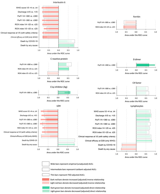 Representation of the empirical and adjusted discriminative ability of the markers for discerning clinical milestones for each of the 38 marker–milestone pairs analysed. The bars represent the areas under the empirical (clear bars) and adjusted (coloured bars) ROC curves of the discriminative ability of each marker to discern between the dichotomised clinical milestones for each of the 38 marker–milestone pairs identified in the partial least squares regression. Red bars denote inverse relationships (the greater the value of the marker, the lower the probability of the clinical event), whilst green bars denote direct relationships (the greater the value of the marker, the higher the probability of the clinical event). Abbreviations: Ag, antigenic; AUC, area under the curve; D28, day 28; LDH, lactate dehydrogenase; ROC, receiver operating characteristic; Pa/Fi, quotient between the peripheral oxygen saturation and the inspiratory oxygen fraction; ROX, ROX index (the ratio of Pa/Fi to respiratory rate); TSO, time since symptom onset; V4, visit 4; V5, visit 5; WHO, World Health Organization.