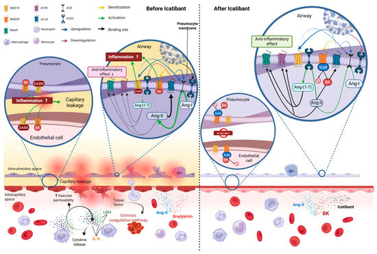 Summary of COVID-19 pathophysiology: lessons learned from this study after exposure to icatibant. Left panel: Since the BK/BKB2R pathway generates inflammation (cytokine release and white blood cell recruitment), vasodilation (with capillary leakage and oedema formation), ACE2 downregulation (thin dashed arrows), and ACE upregulation (continuous thick arrows), icatibant (right panel), a selective competitive BKB2R antagonist, would break one of the inputs of the vicious proinflammatory feedback loop created by the SARS-CoV-2 infection. The higher availability of ACE2 should increase the Ang-(1–7) levels by metabolising Ang-II, increasing the ACE2/MasR pathway anti-inflammatory signalling. Also, less circulating Ang-II should reduce the AT1R signalling, thus reducing its synergistic proinflammatory augmentation. Abbreviations: ACE, Angiotensin-Converting Enzyme; Ang, Angiotensin; AT1R, Angiotensin II Type 1 Receptor; AT2R, Angiotensin II Type 2 Receptor; BK, Bradykinin; BKB1R, Bradykinin B1 Receptor; BKB2R, Bradykinin B2 Receptor; DABK, des-Arg9-Bradykinin; Icat, Icatibant; IL-6, Interleukin 6; MasR, Mas Receptor.