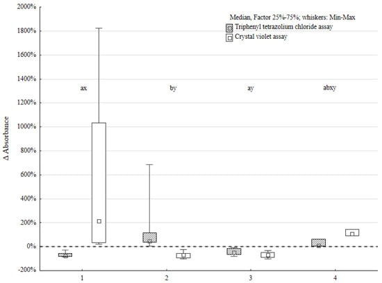 Metabolic activity of biofilms (TTC) and biofilm biomass (CV) changes expressed as Δ absorbance in four distinct groups of Pseudomonas aeruginosa (n = 23) and Proteus mirabilis (n = 23) mixed biofilms; the letters reflect statistically significant differences for TTC assay results (a, b) and CV assay investigation (x, y), respectively, to the observed groups: group 1—TTC ↓, CV ↑ (n = 5), group 2—TTC ↑, CV ↓ (n = 5), group 3—TTC ↓, CV ↓ (n = 11), and group 4—TTC ↑, CV ↑ (n = 2).