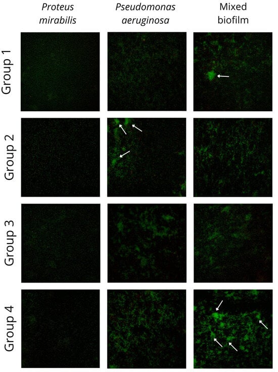Pictures of mixed and single species biofilms of Pseudomonas aeruginosa and Proteus mirabilis. Biofilm was cultivated on sterile culture dishes and imaged using Elyra PS.1 (Carl Zeiss Microscopy GmbH) fluorescence microscopy system. Samples were imaged using super-resolution SIM mode with 488 nm laser lines for fluorophore excitation. A plan-apochromat 20×/0.8 objective was used. The visible area was about 0.25 mm × 0.25 mm. Images were acquired in the emission channel for live cells (marked by green fluorescent SYTO 9). Groups were divided based on the biofilm biomass (CV assay) and metabolic activity (TTC assay), respectively, to the observed groups: group 1—TTC ↓, CV ↑ (n = 5), group 2—TTC ↑, CV ↓ (n = 5), group 3—TTC ↓, CV ↓ (n = 11), and group 4—TTC ↑, CV ↑ (n = 2); white arrows indicate the microcolonies.